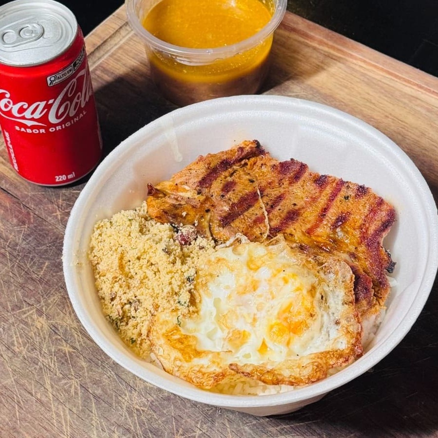 Suculencia e qualidade bisteca suína, ovo frito farofa, arroz e feijao (nao contem coca)