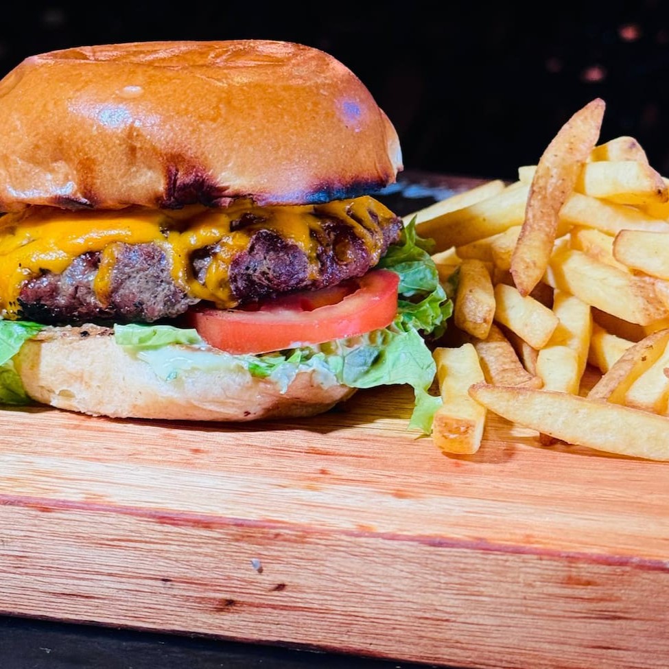 Hambúrguer, queijo prato, alface, cebola e maionese da casa. Acompanha fritas