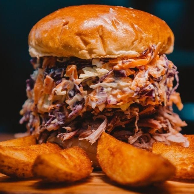 Fomoso pulled pork é a paleta suína que passa por um processo de 15 horas assando em lenha frutífera. Nesse lanche temos 400g só de carne salada coleslaw e barbecue da casa, acompanha batata rustica