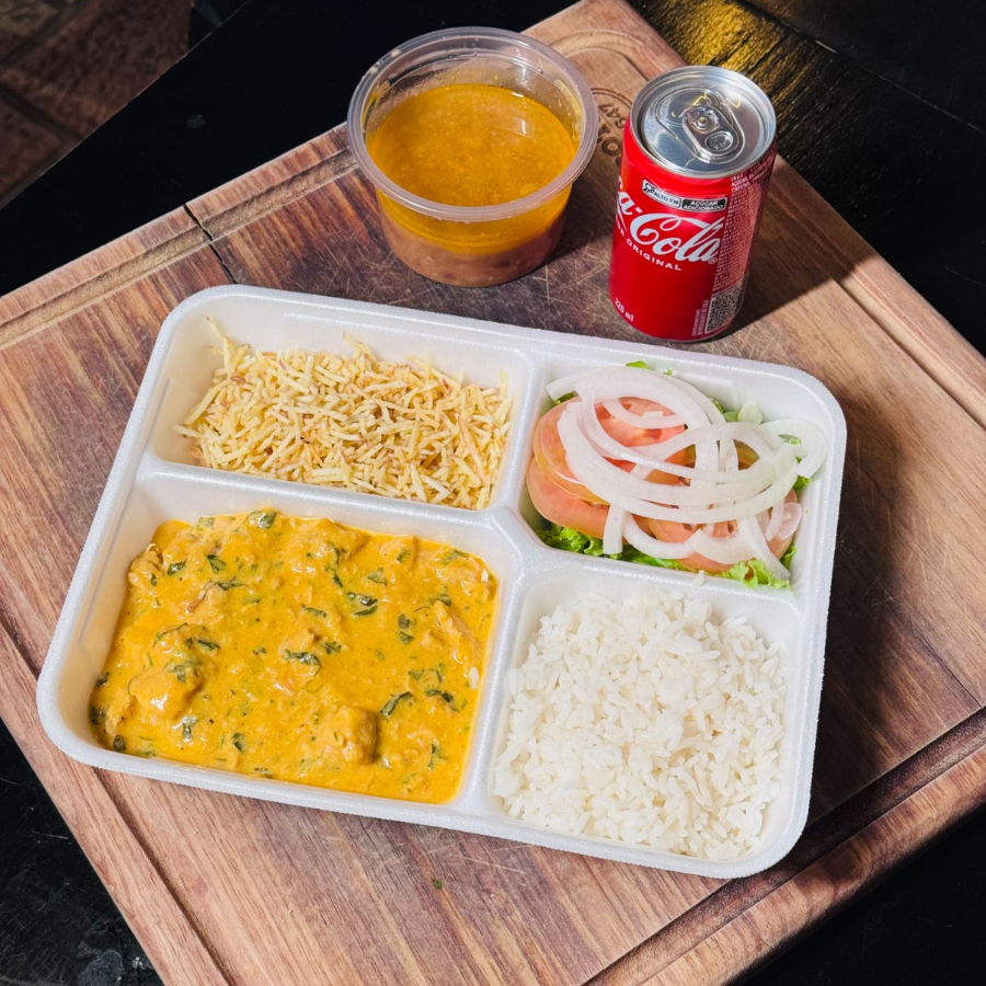 Arroz, feijão, salada, batata palha e strogonoff. (nao contem coca)