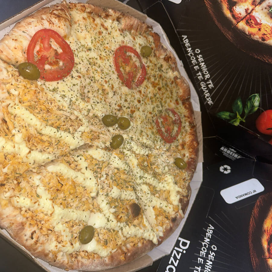 Calabresa, mussarela, pimenta, cebola, molho de tomate, azeitona e orégano.