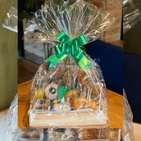 -Pão de deus, mini pão de queijo 4 un., peito de peru 100g, queijo prato 100g, muffin de blueberries, biscoito de areias, caixinha de brigadeiros 4un. cesta de pães de fermentação natural, suco natural de laranja. acompanhamentos: mantegia 50g,, requeijão 50g,, geleia da casa50g. –