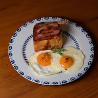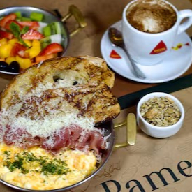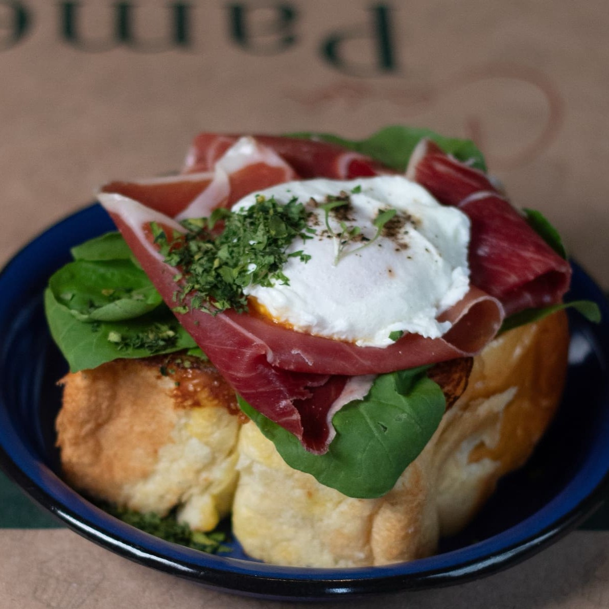 - Ovo pochê com toast de pão brioche, fatias de presunto cru, queijo meia cura chapeado e salada de rúcula. Finalizado com salsa e flor de sal.