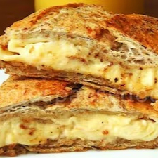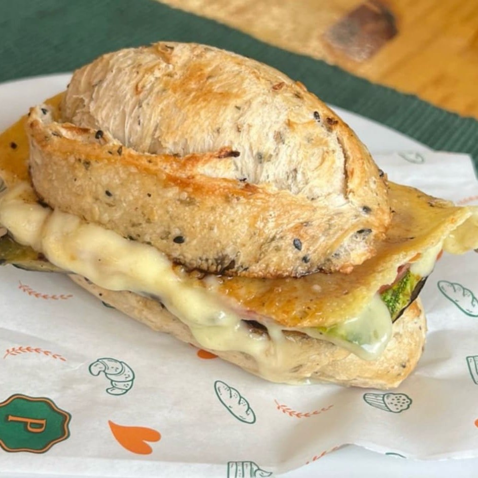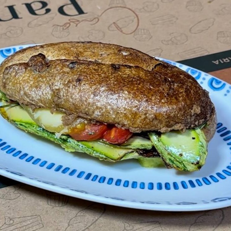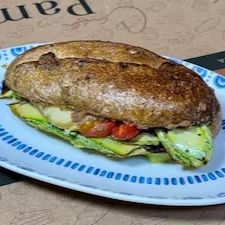 - Lanche em pão de Especiarias na chapa com manteiga de ervas, redução de balsâmico, abobrinha, berinjela, tomate, queijo meia cura, amêndoas laminadas –