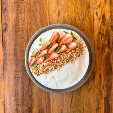 - Ovos estrelados com bacon, salada de frutas com granola, café coado –