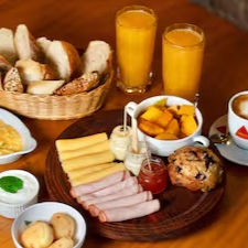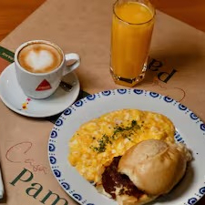 - Porção de mini pão de queijo (4 und), cesta de pães de fermentação natural, dois sucos de laranja natural, um café com leite, ovos mexidos, fruta fresca, peito de peru 100g, queijo prato 100g , muffin de blueberry, acompanha geleia da casa, manteiga e requeijão