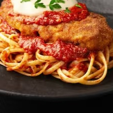 Peito de frango empanado, com queijo gratinado. Servido com massa fresca no molho pomodoro –