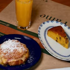 - Pão de deus na chapa com presunto e queijo prato, suco natural de laranja, fatia de bolo do dia –