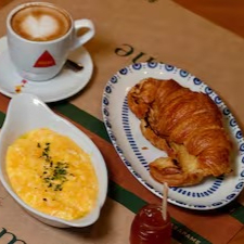 - croissant na chapa com geleia da casa (maçã e tomate), ovos mexidos e café mocha –