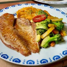 - Tilápia grelhada, acompanha legumes salteados e purê de abóbora cabotiã –