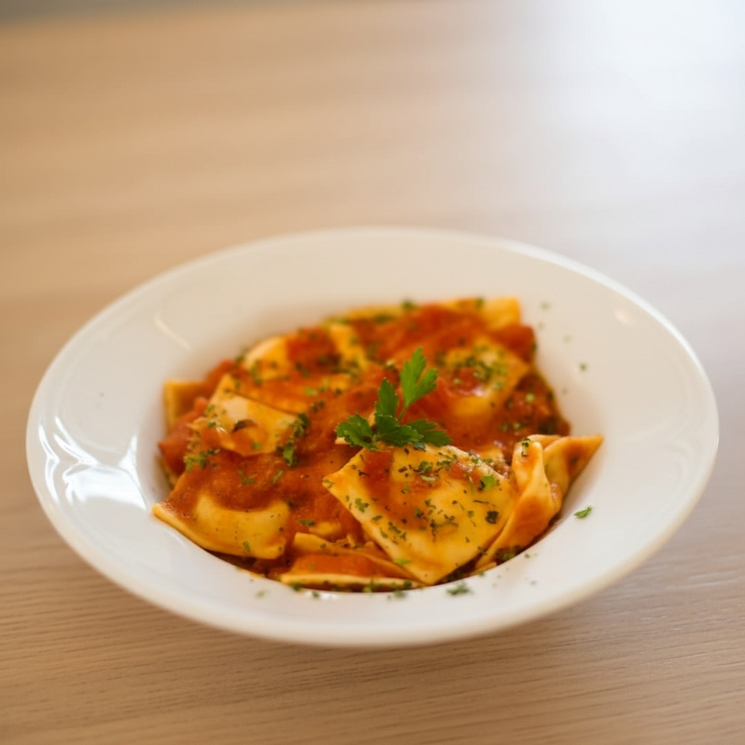 Ravióli de muzarela no molho rustico de tomates e manjericão