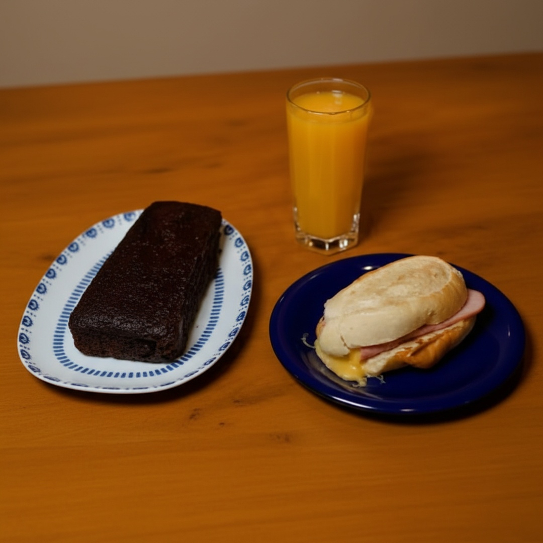 - 2 mistos quentes no pão francês (presunto e queijo), dois sucos de laranja, bolo inglês de chocolate 300g –