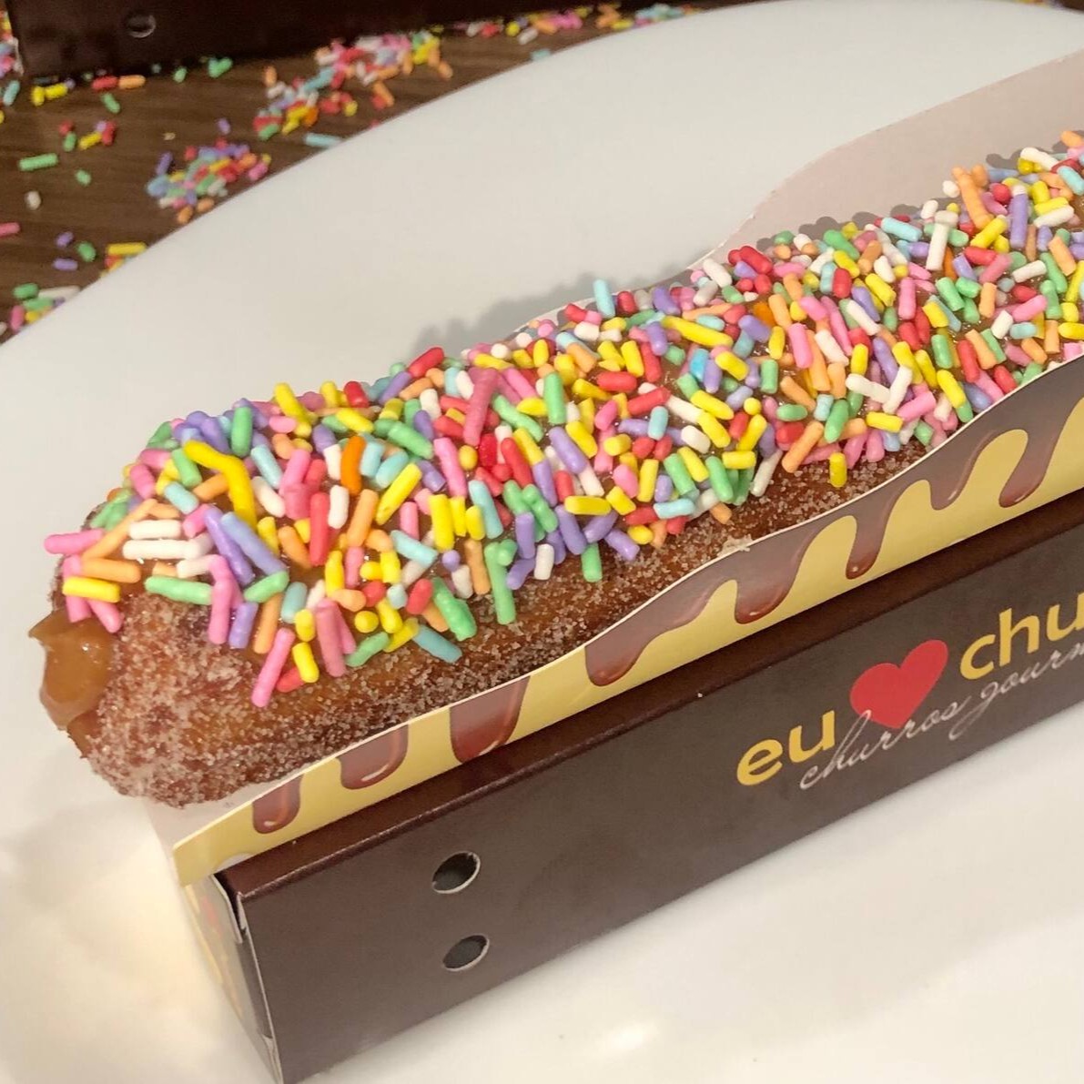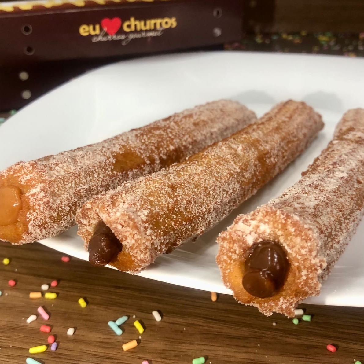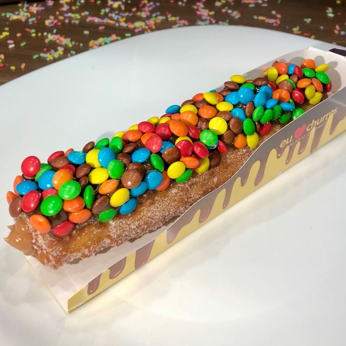 Churros fresquinho e feito na hora com açúcar e canela, recheio de doce de leite ou chocolate, coberto com Confeti