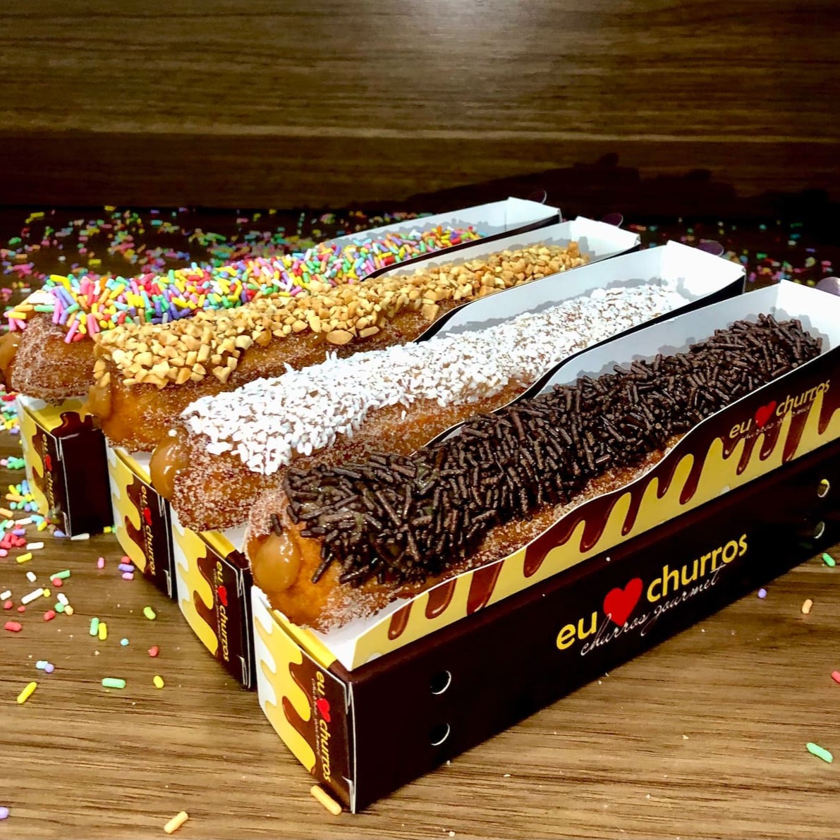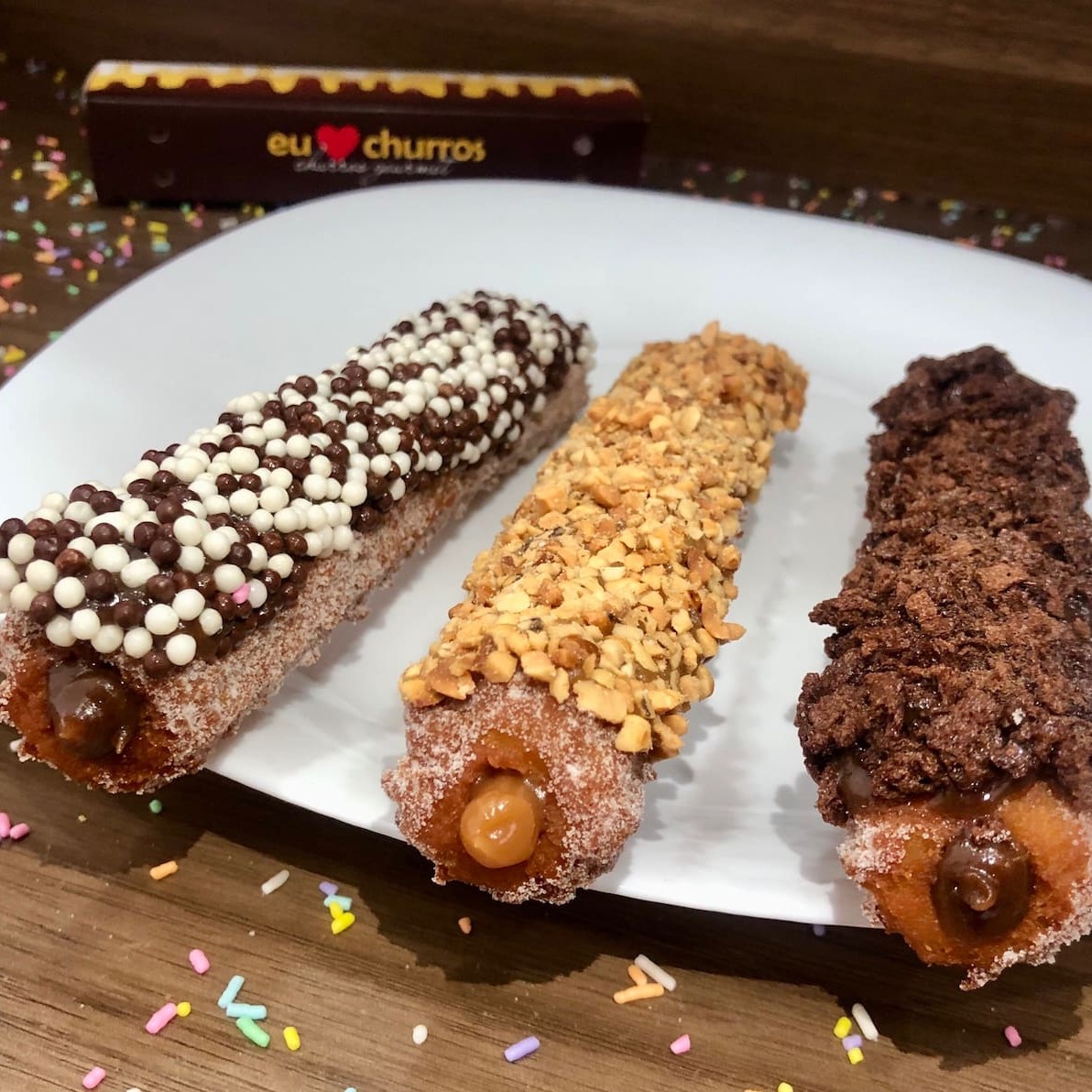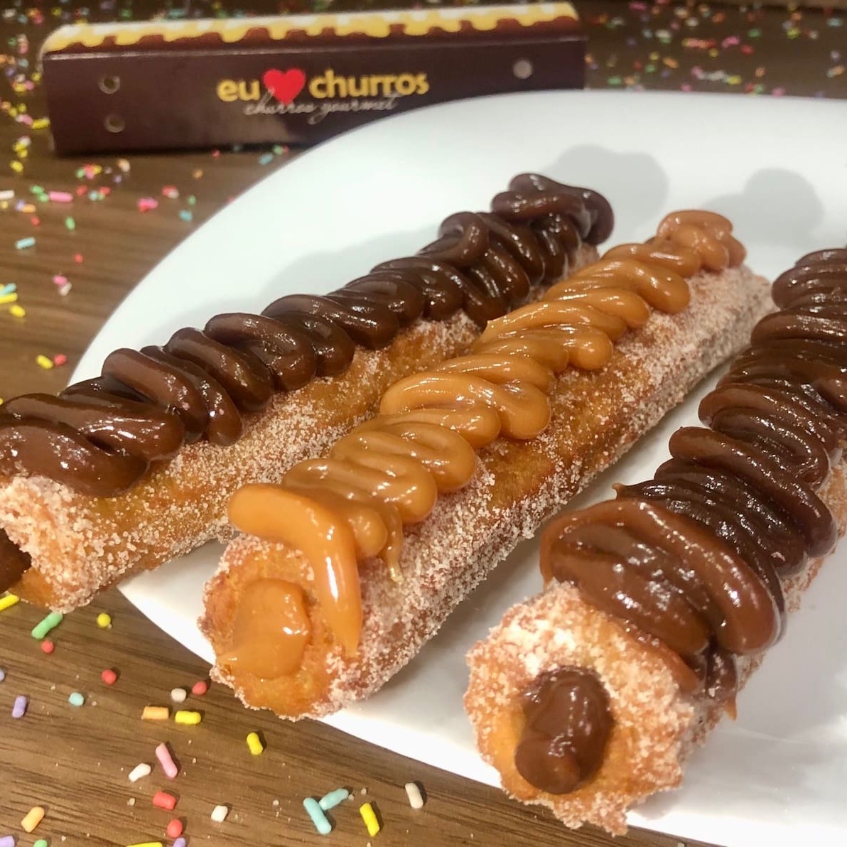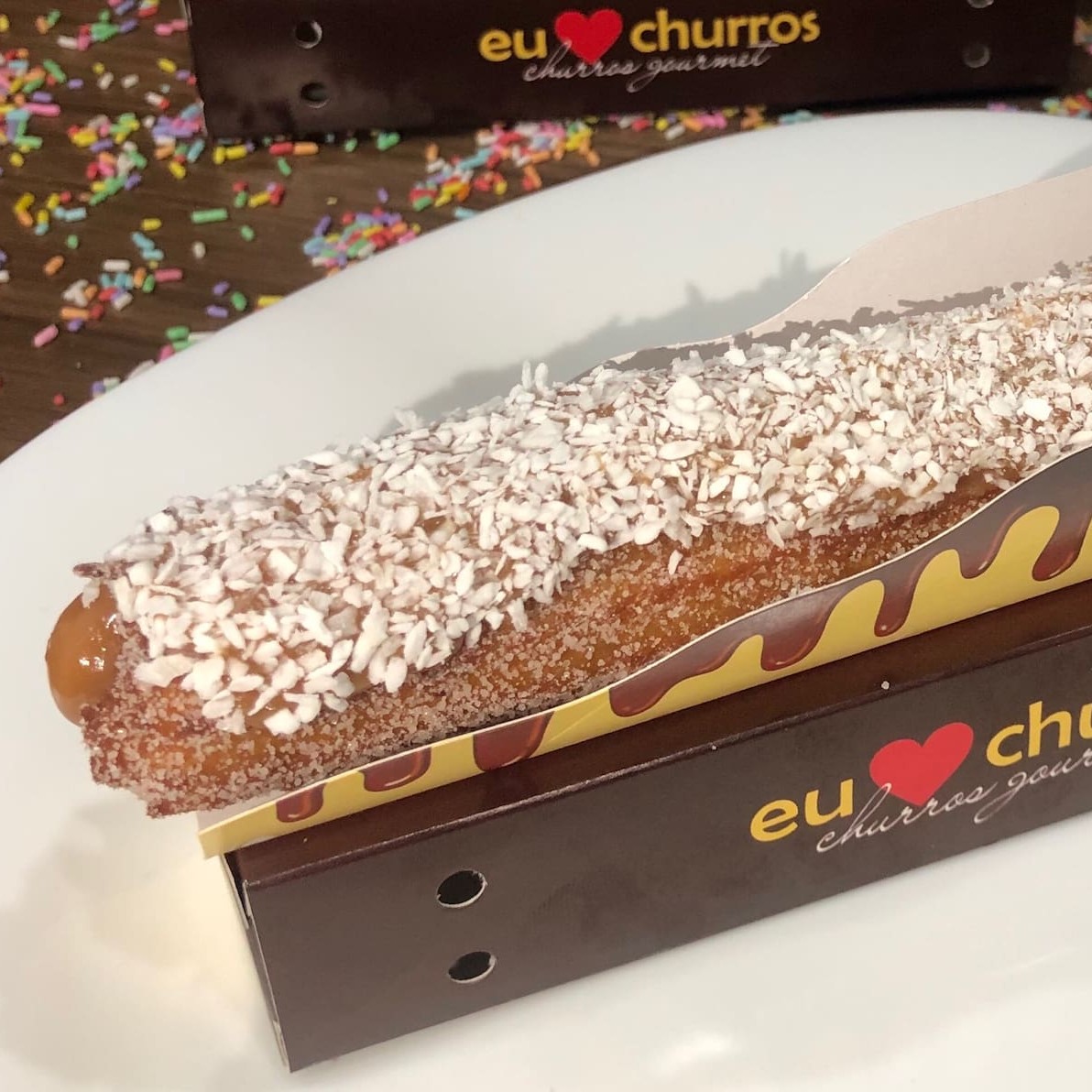 Churros fresquinho e feito na hora com açúcar e canela, recheio de doce de leite ou chocolate, coberto com Confeti