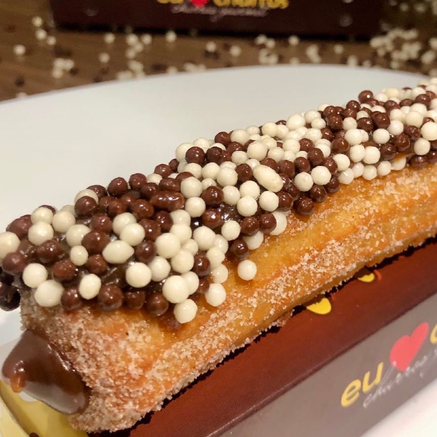 Churros fresquinho feito na hora com açúcar e canela, recheio de doce de leite ou Chocolate por dentro e por fora, com cobertura de Bis branco