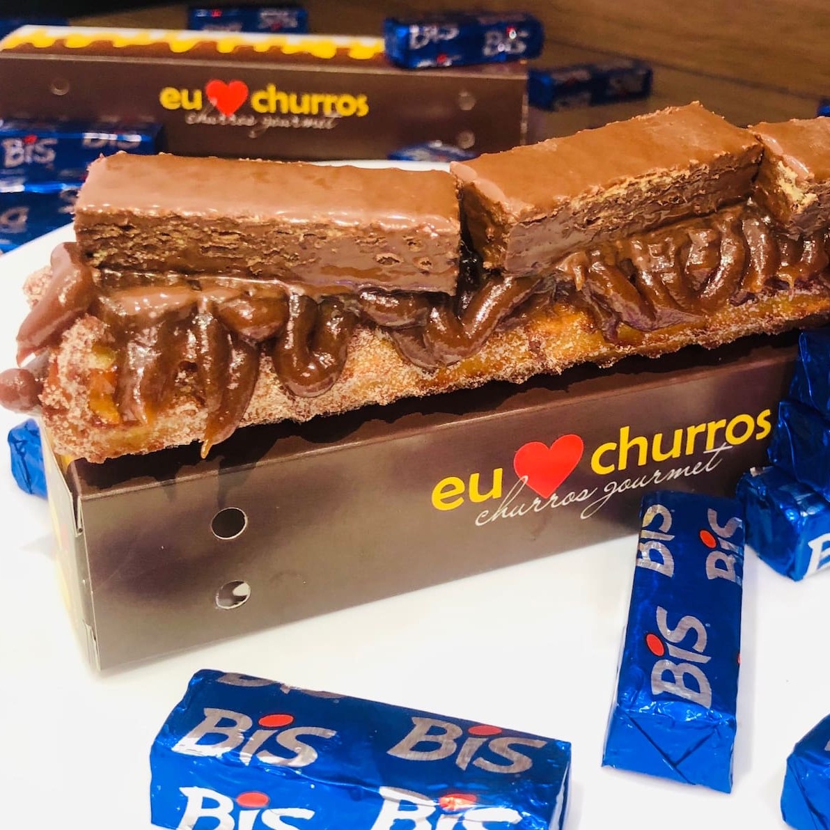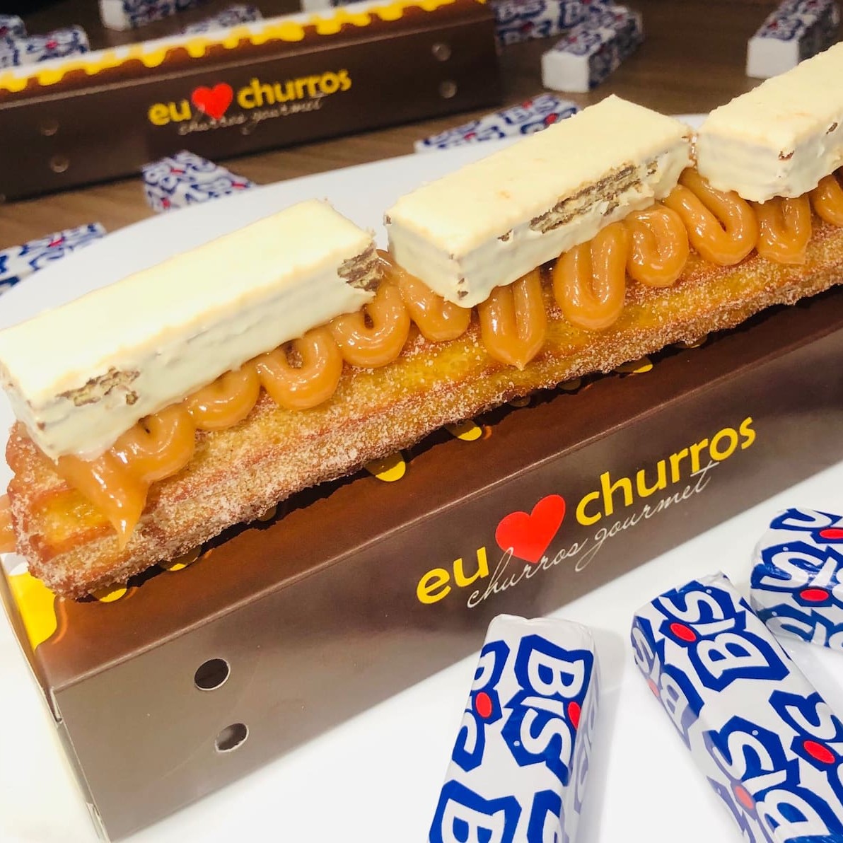 Churros fresquinho feito na hora com açúcar e canela, recheio de chocolate ou doce de leite por dentro e por fora, com cobertura de Bis Original