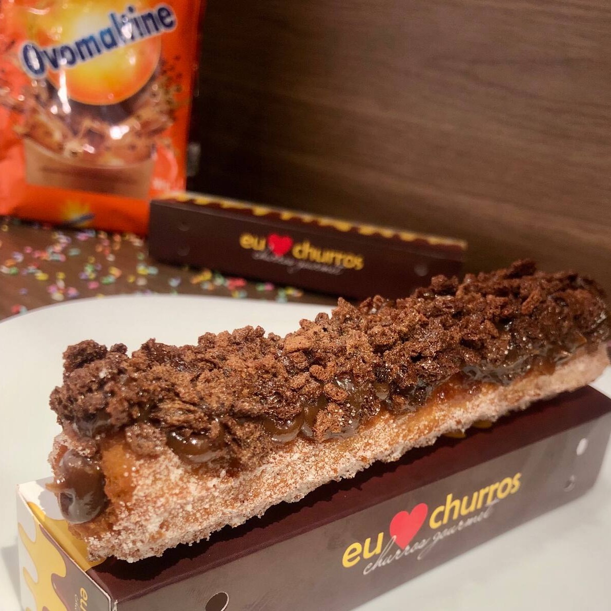 Churros fresquinho e feito na hora com açúcar e canela, recheio de doce de leite ou chocolate, coberto com Ovomaltine