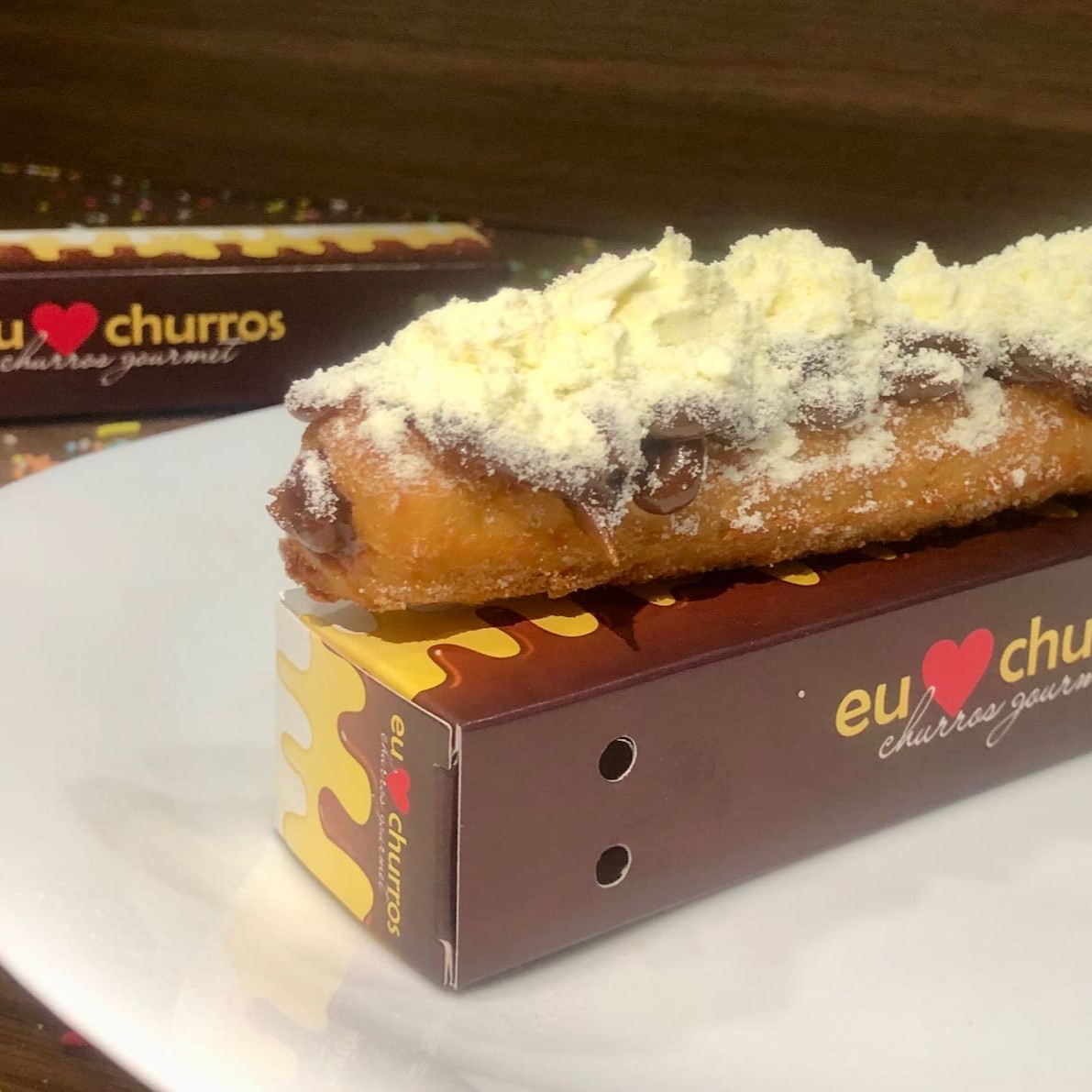 Churros fresquinho e feito na hora com açúcar e canela, recheio de doce de leite ou chocolate, coberto com leite em pó