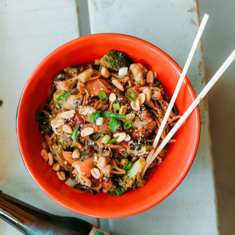 Yakisoba tradicional de legumes,macarrão crocante e nosso molho mais que especial, gergelim e amendoim e cebolinha. Pan fried noodles with loads of, veggies and dark soy sauce