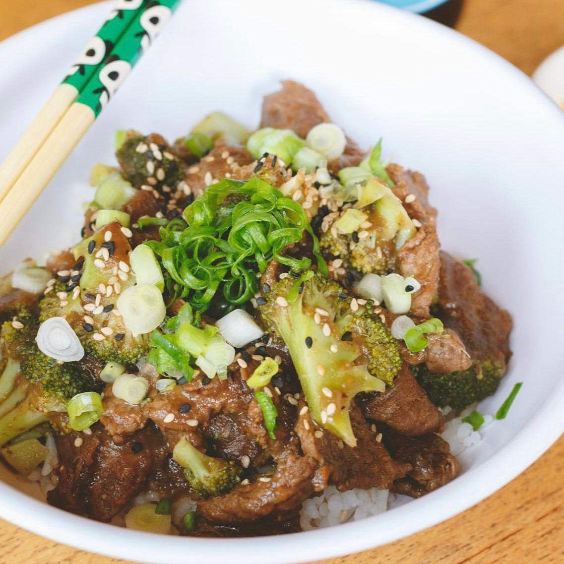 Fatias de carne com brócolis, molho delicioso e arroz! Um prato clássico da culinária chinesa. Sliced beef with broccoli, delicious sauce and rice! A classic Chinese dish. Sem Glutén