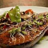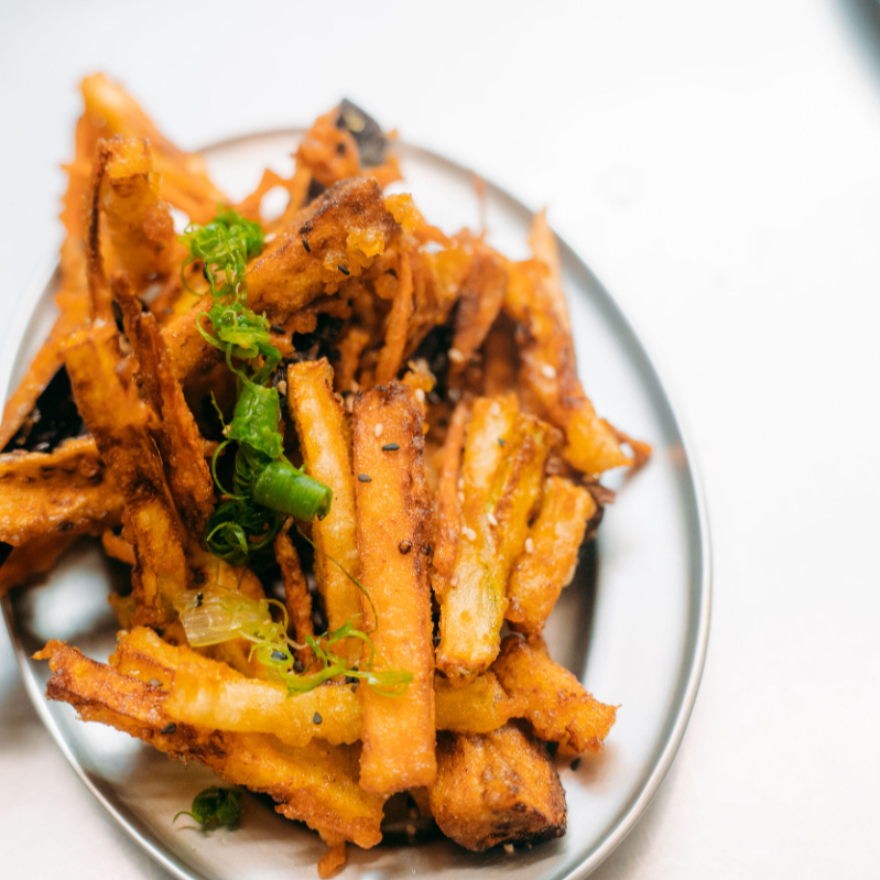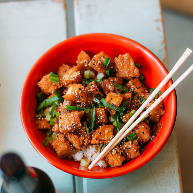 Brócolis e couve flor frito na massa de tempura, com um molho de laranja levemente picante, com arroz branco e cebolinha verde. Brocoli and cauliflower bites with sweet and sour orange sauce, white rice and chives.