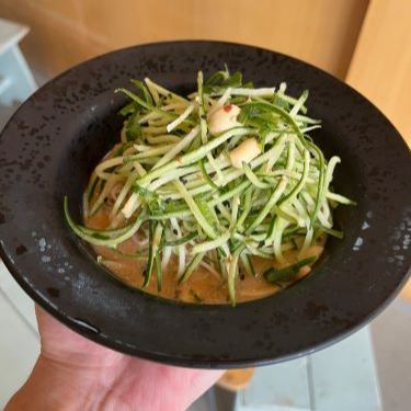 Queridinho da casa, uma receita nossa que leva macarrão somen frio com molho cremoso de pasta de amendoim, shoyu, limão e cebolinha, com um toque de pimenta e pepino. Peanut Butter Noodles, sauce is lactose free, a creamy concoction of peanut butter, lime, soy sauce, chives, and a dash of hot sauce, and shaved cucumbers.