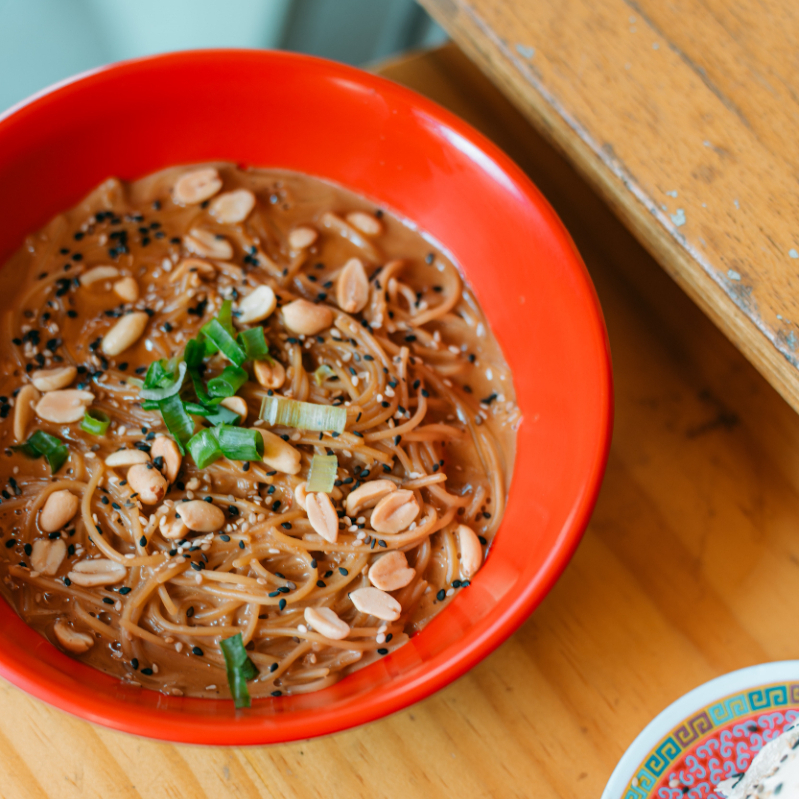 Queridinho da casa, uma receita nossa que leva macarrão quente com molho cremoso de pasta de amendoim, shoyu, limão e cebolinha, com um toque de pimenta. Peanut Butter Noodles, sauce is lactose free, a creamy concoction of peanut butter, lime, soy sauce, chives, and a dash of hot sauce, and shaved cucumbers.