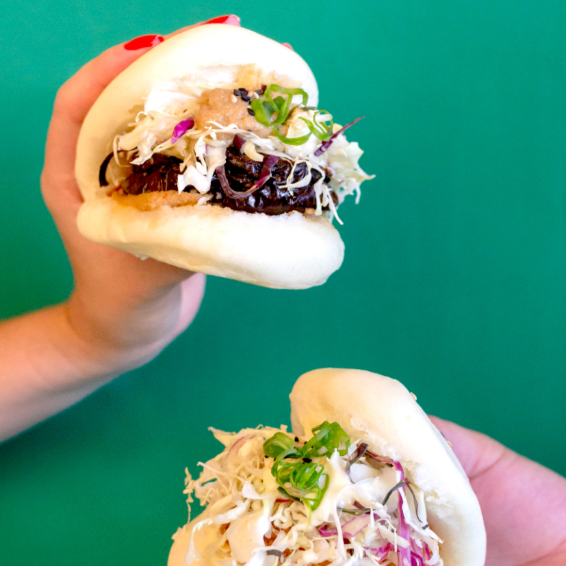 1 und bao, barriga de porco desfiado, acompanha maionese de limão e salada de repolho 1 pork bao bun, fluffy as a cloud, with pulled pork belly, lime mayo, and shaved cabbage