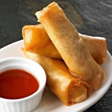 Massa fina recheado com frango desfiado, cenoura desfiada e repolho acompanhado de molho agridoce.