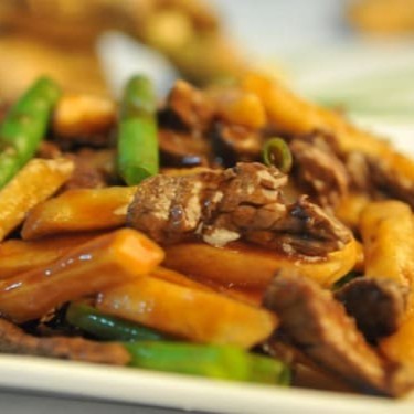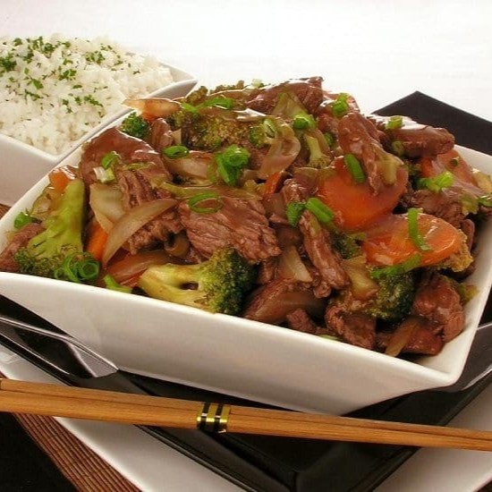 Fatias de carne com legumes diversos, acompanhados do nosso molho exclusivo à base de shoyu e alho.