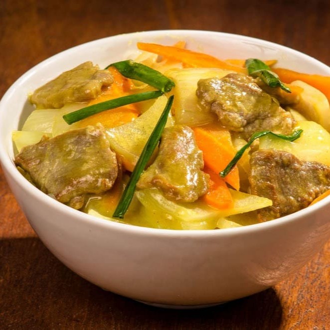 Fatias de carne temperada com cebola, cenoura ao molho a curry salpicado com cebolinha.