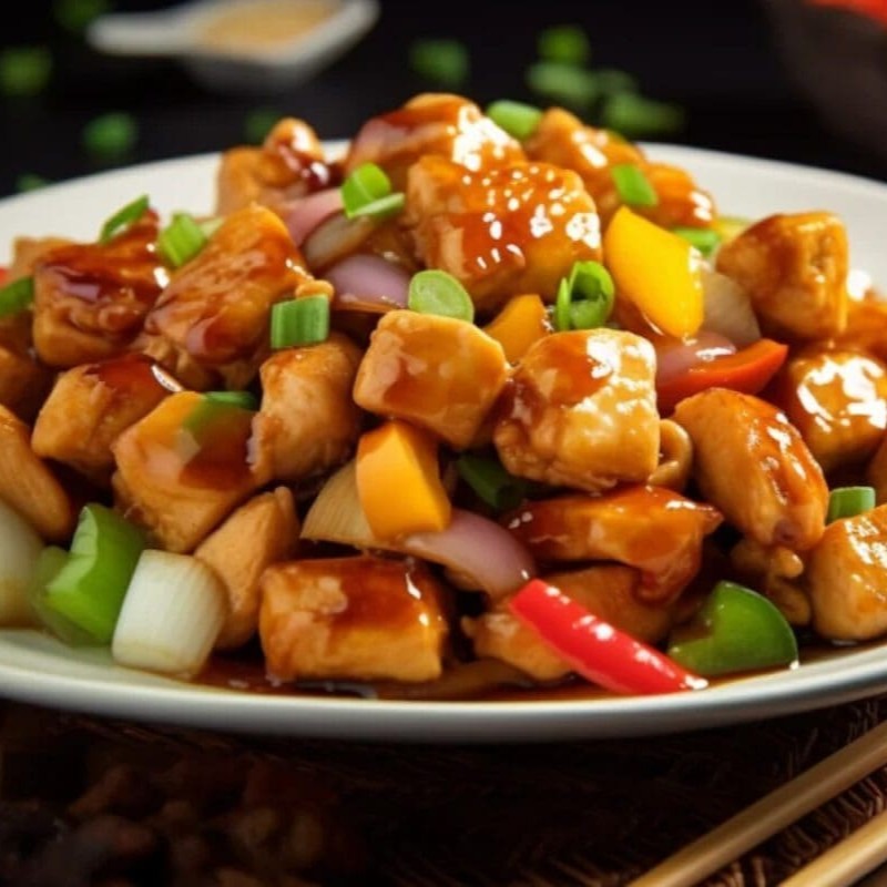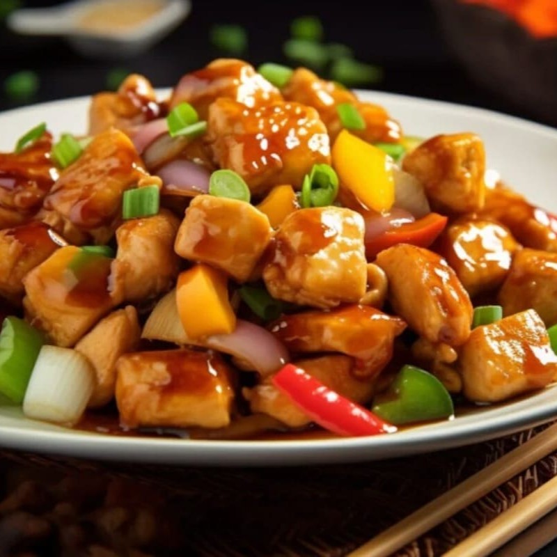 Cubos de peito de frango douradinhos, com legumes (, brócolis, cebola, cenoura, pimentão verde, repolho) temperados com nosso molho especial à base de shoyu.