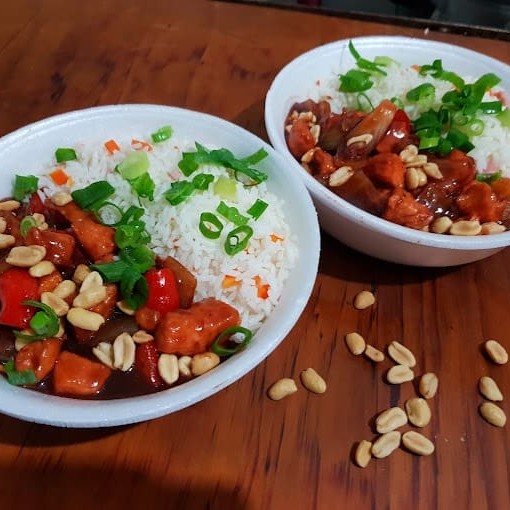 Porção de pedaços de frango com cebola, pimentões e amendoim, servidos com nosso molho exclusivo à base de shoyu. Acompanhado com arroz salpicado com cebolinha.