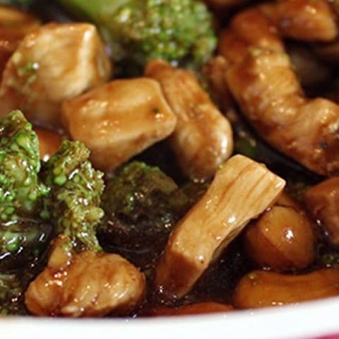 Cubo de peito de frango dourado temperado com brocolis ao molho especial a base de shoyu.