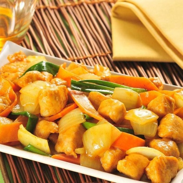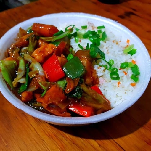 Cubos de peito de frango douradinhos, com legumes ( brócolis, cebola, cenoura, pimentão verde, repolho) temperados com nosso molho especial à base de shoyu acompanhado com arroz salpicado com cebolinha.