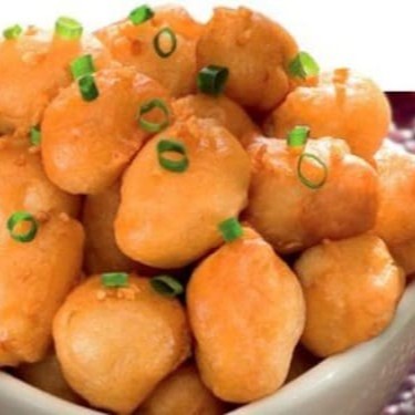 Cubos de peito de frango temperado e empanados salpicado com cebolinha acompanha molho agirdoce.