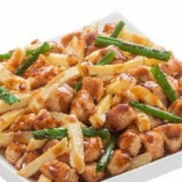 Cubos de peito de frango temperado acompanhado com batatas e cebolinha com o nosso molhos exclusivo à base de shoyu, gengibre e alho.