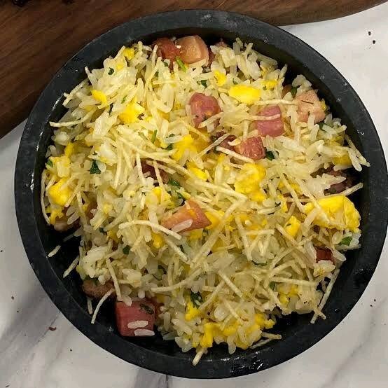 Nosso arroz Biro Biro e Feito com bacon,ovos fritos,arroz,batata palha