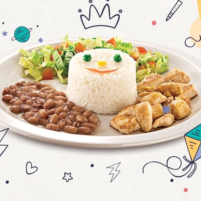 Arroz branco, salada de alface e tomate, batata Smiles e filé de frango picado