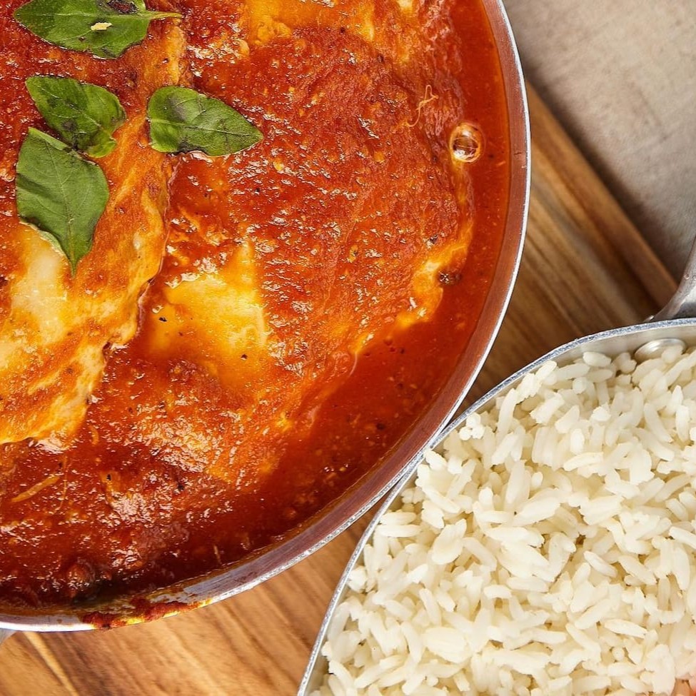 Filé de frango à parmegiana, coberto com molho e queijo, acompanhado de arroz e fritas. Uma delícia irresistível.