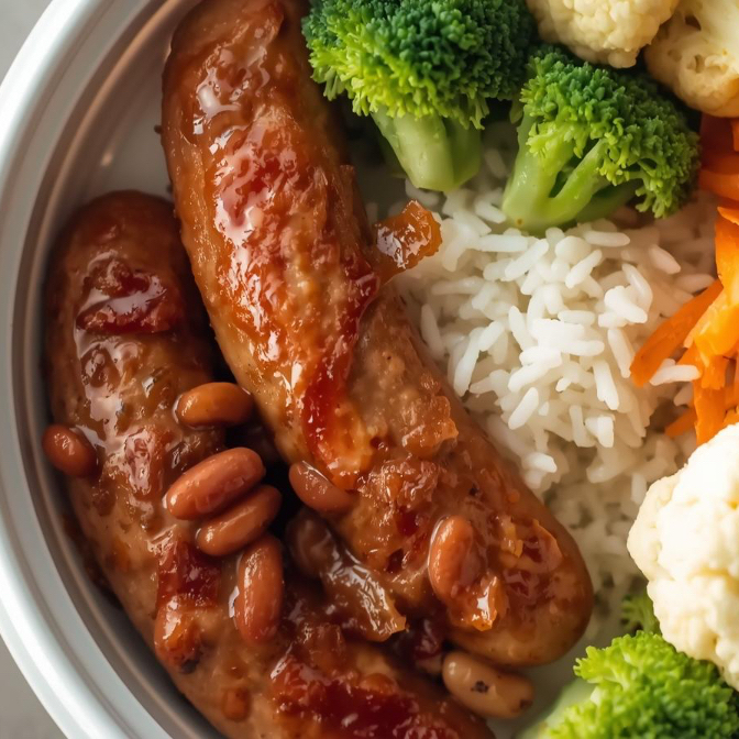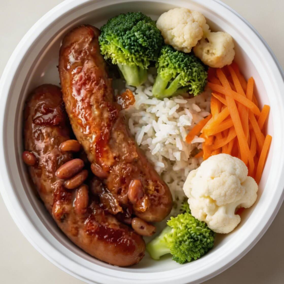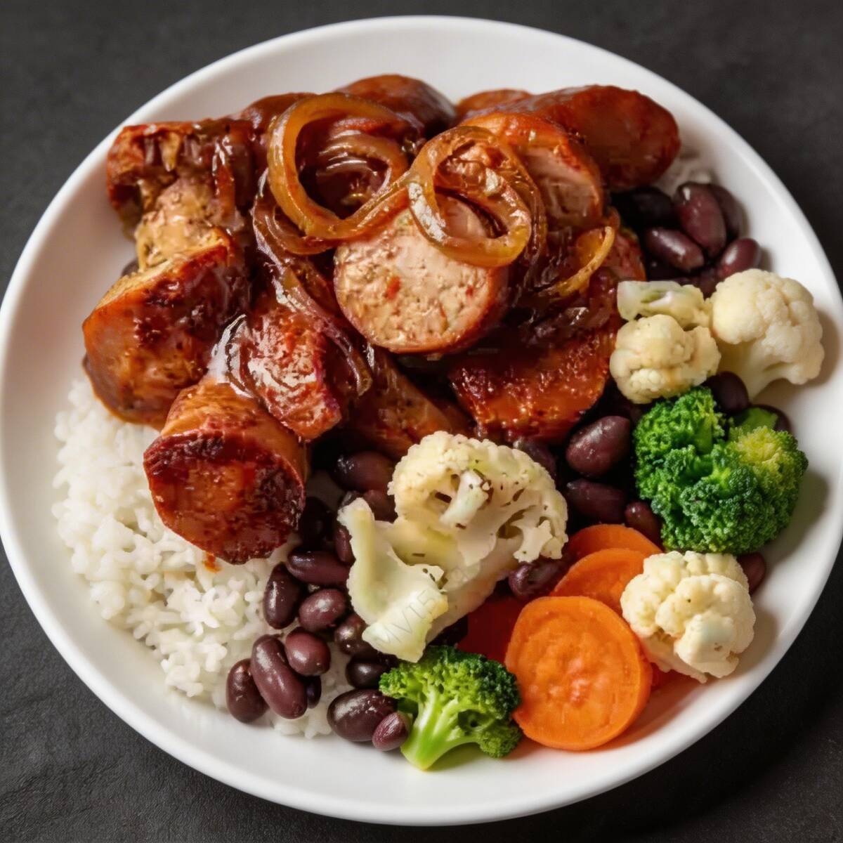 Deliciosa Marmita de Linguiça Toscana grelhada na chapa, acompanha Arroz, Feijão, Farofa e Legumes. Grátis bebida de 200ml!
