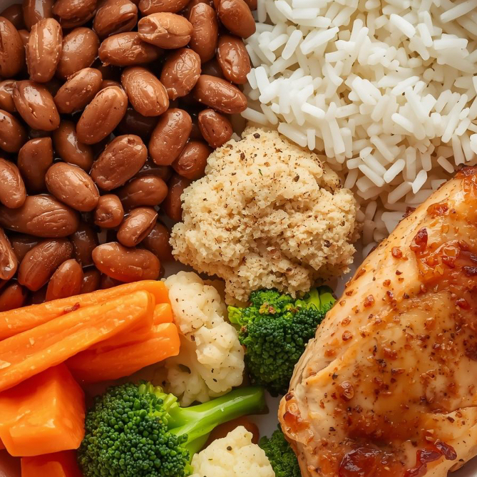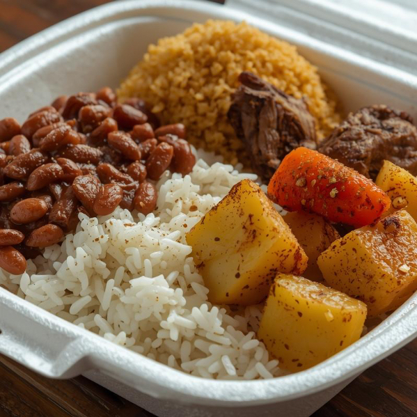 Deliciosa Marmita de Mistinho - Carne, Frango e Linguiça grelhados na chapa, acompanha Arroz, Feijão, Farofa e Legumes. Grátis bebida de 200ml!