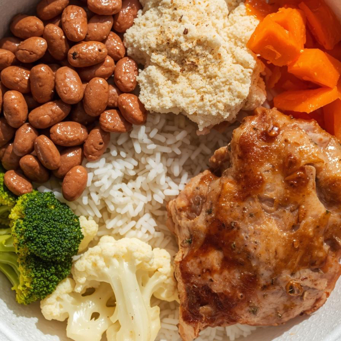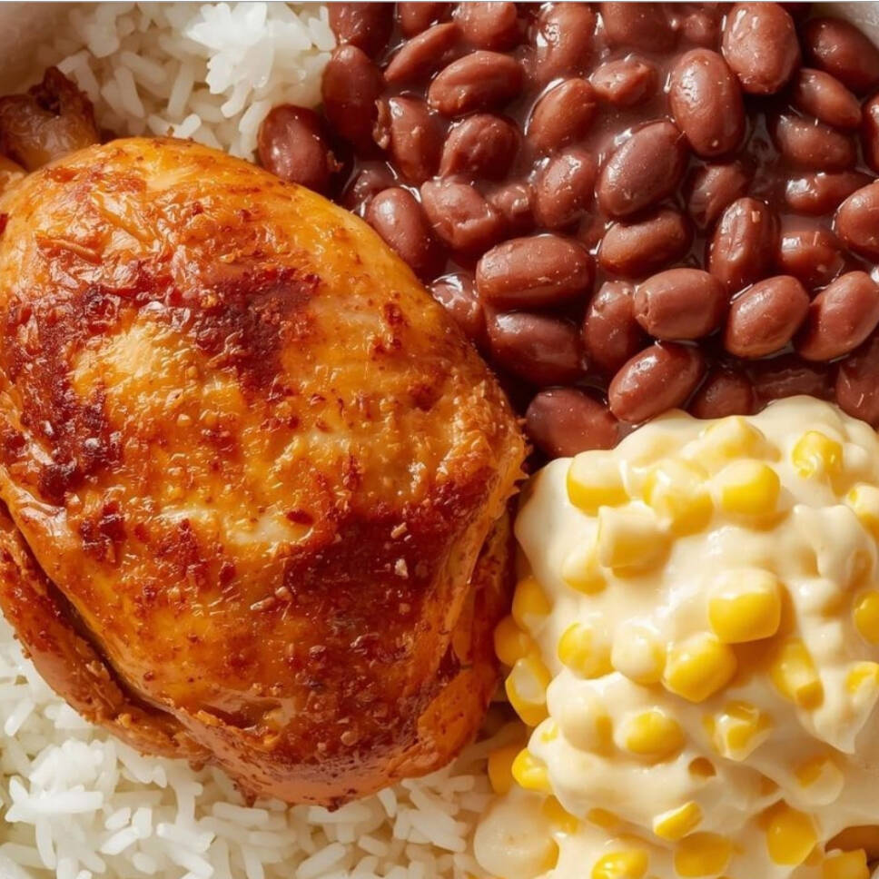 Deliciosa Marmita de Frango Assado de Padaria com Creme de Milho, acompanha Arroz e Feijão. Grátis bebida de 200ml!