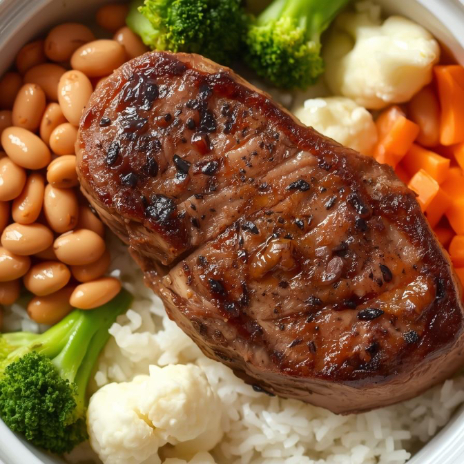 Deliciosa Marmita de Bisteca de Porco grelhada na chapa, acompanha Arroz, Feijão, Farofa e Legumes. Grátis bebida de 200ml!