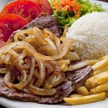 Arroz, Feijão, Contra Filé Acebolada, Ovo, Fritas e Salada
