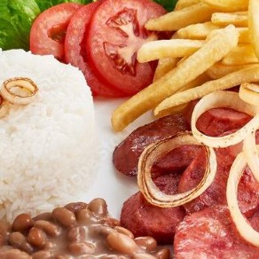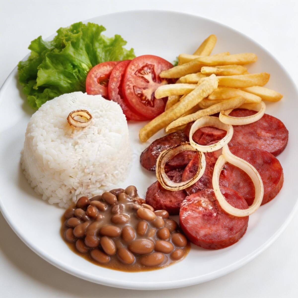 Arroz, Feijão, Calabresa Acebolada, Ovo, Fritas e Salada