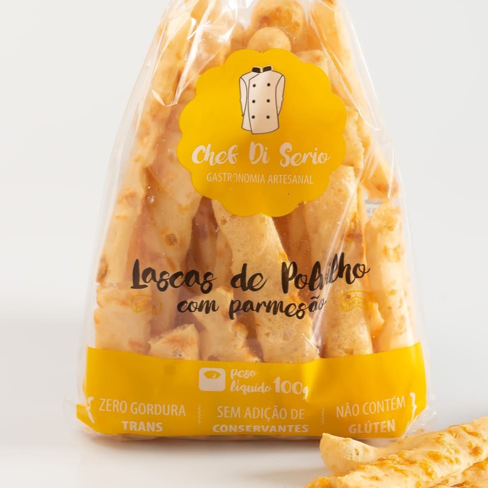 As Lascas de polvilho sabor parmesão da marca Chef Di Serio, são produzidas apenas com ingredientes naturais, livre de conservantes, glúten e gorduras trans. Com sua crocância e sabor especial se tornam uma opção de snack prático, ideal para lanches rápidos. Alérgicos: Contém leite e ovo. Uma opção prática e saudável para consumir em lanches intermediários, lanches escolares, trabalho, academia, faculdade, ou em qualquer outro lugar.
