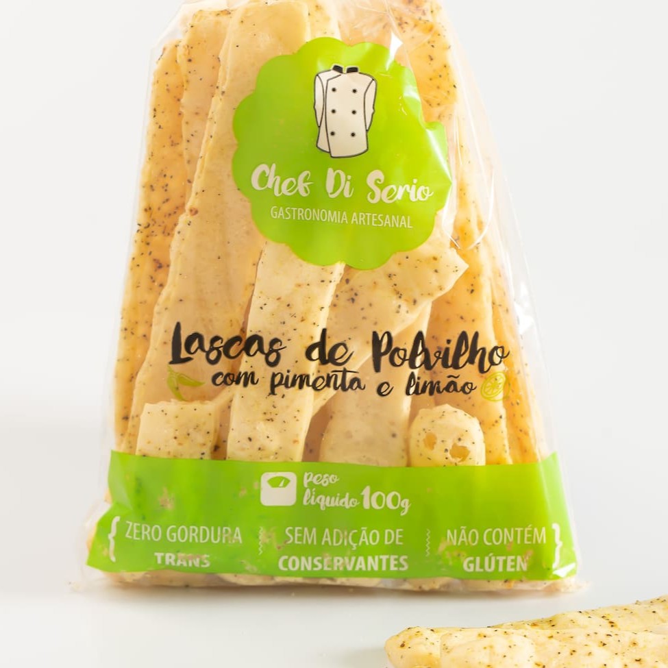 As Lascas de polvilho sabor pimenta e limão da marca Chef Di Serio, são produzidas apenas com ingredientes naturais, livre de conservantes, glúten e gorduras trans. Com sua crocância e uma explosão de sabor se tornam uma opção de snack prático, ideal para lanches rápidos. Alérgicos: Contém leite e ovo. Uma opção prática e saudável para consumir em lanches intermediários, lanches escolares, trabalho, academia, faculdade, ou em qualquer outro lugar.