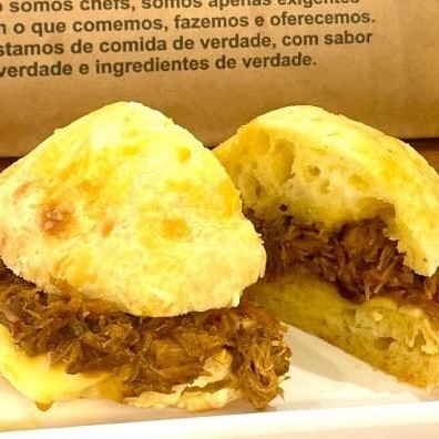 150g de suculenta carne louca, feita com lagarto especial, cozida lentamente e temperada com ervas finas + queijo prato + Pão de hambúrguer crocante, feito de Pão de Queijo revestido com crostas de parmesão (130g).