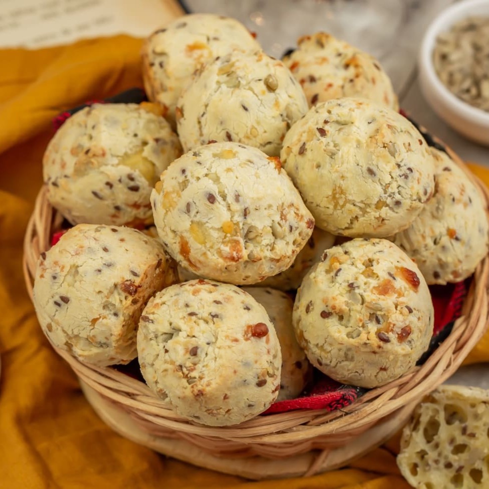 O mais sofisticado Pão de Queijo Multigrãos que você irá provar. Uma delícia saudável e irresistível! Preparado com linhaça, gergelim, quinoa e semente de girassol, ele se destaca por ser um produto funcional dada a quantidade de fibras. Sua composição não contém glúten, tornando-o uma opção perfeita para quem busca um lanche equilibrado e saboroso. Aproximadamente 200g.